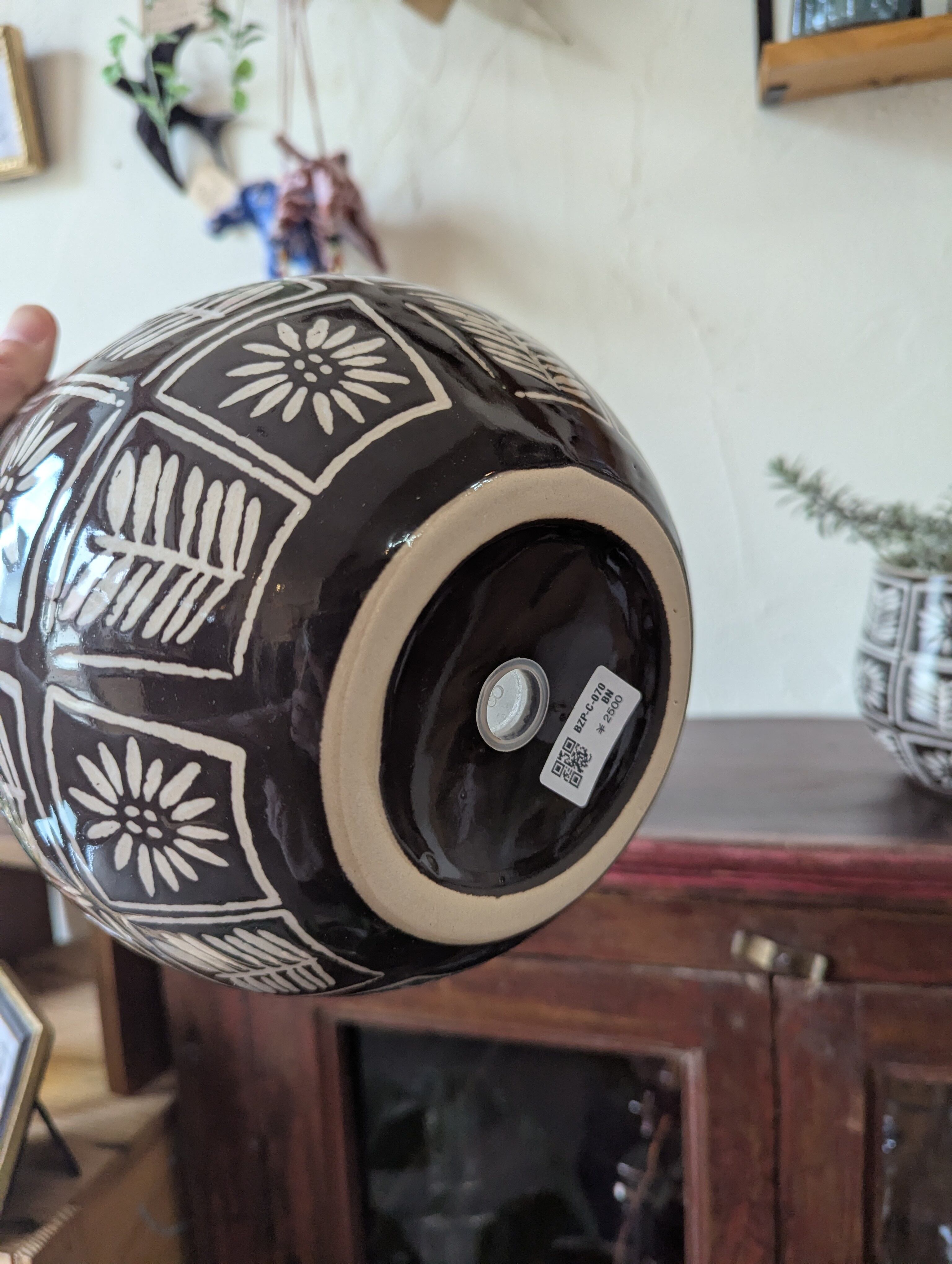 ぽってりとしたフォルムのボタニカル柄の植木鉢です