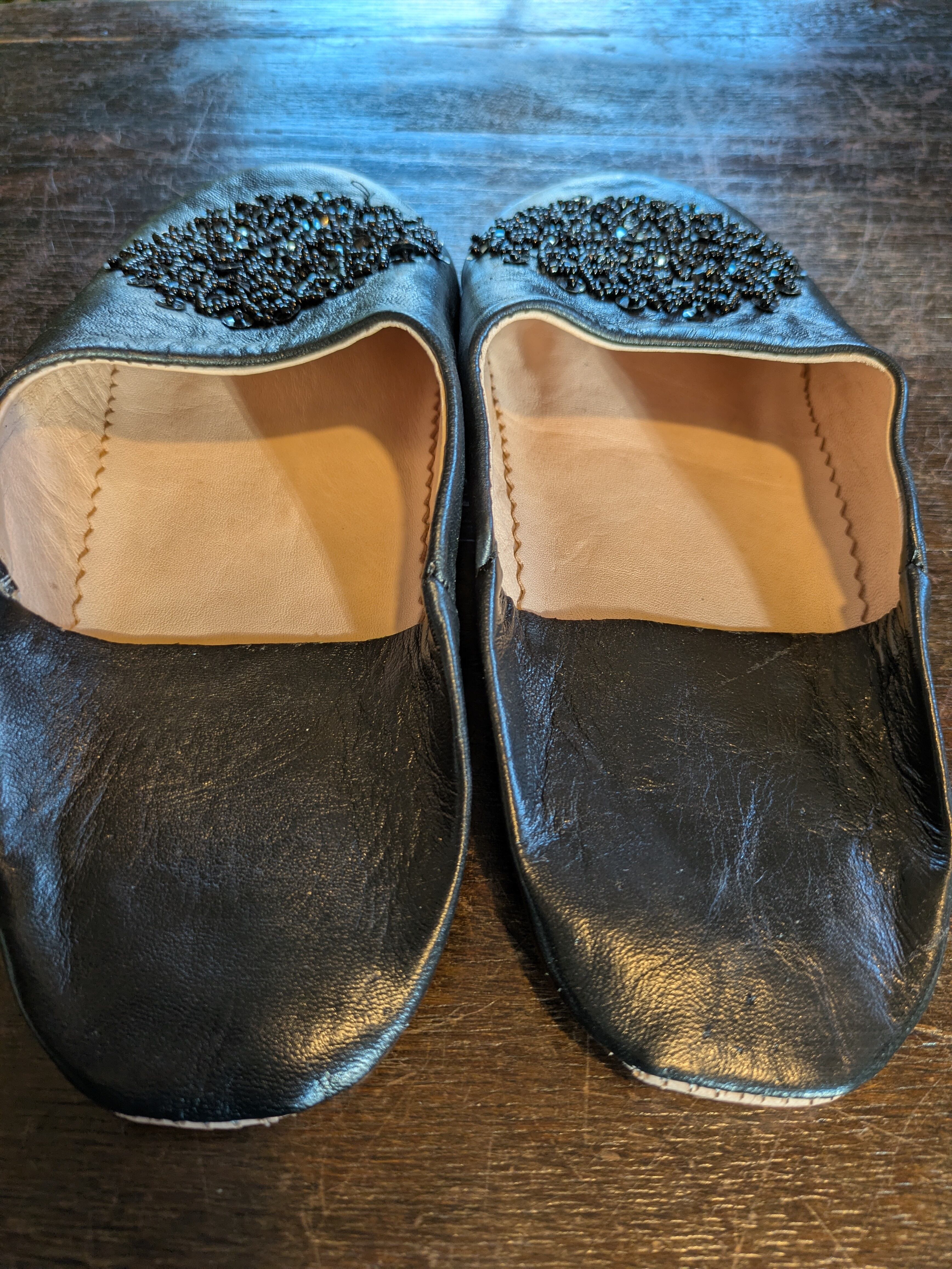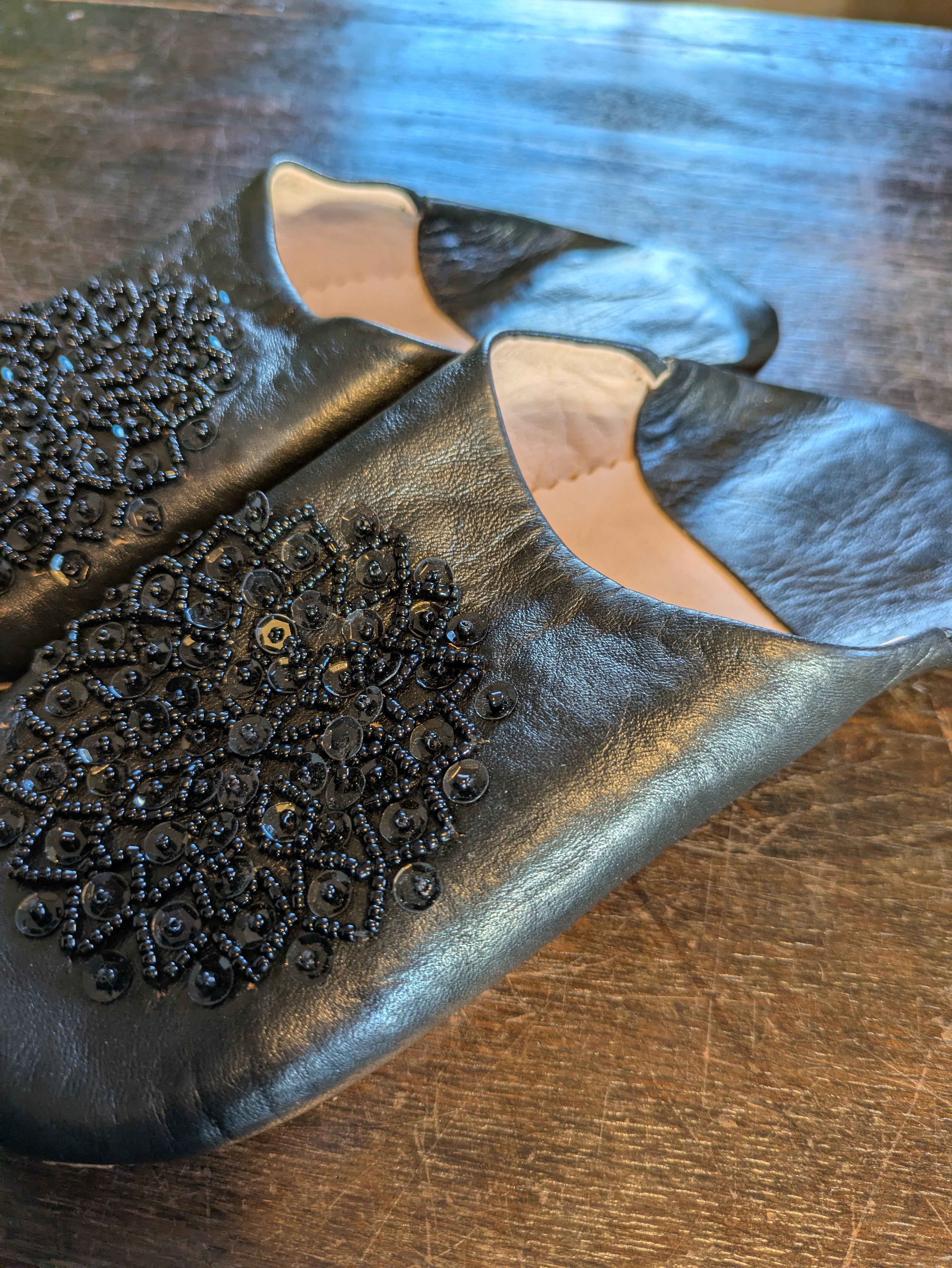 モロッコ伝統刺繍とスパンコールをあしらったバブーシュです