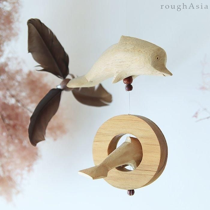 【タイ】木製モビール イルカの親子