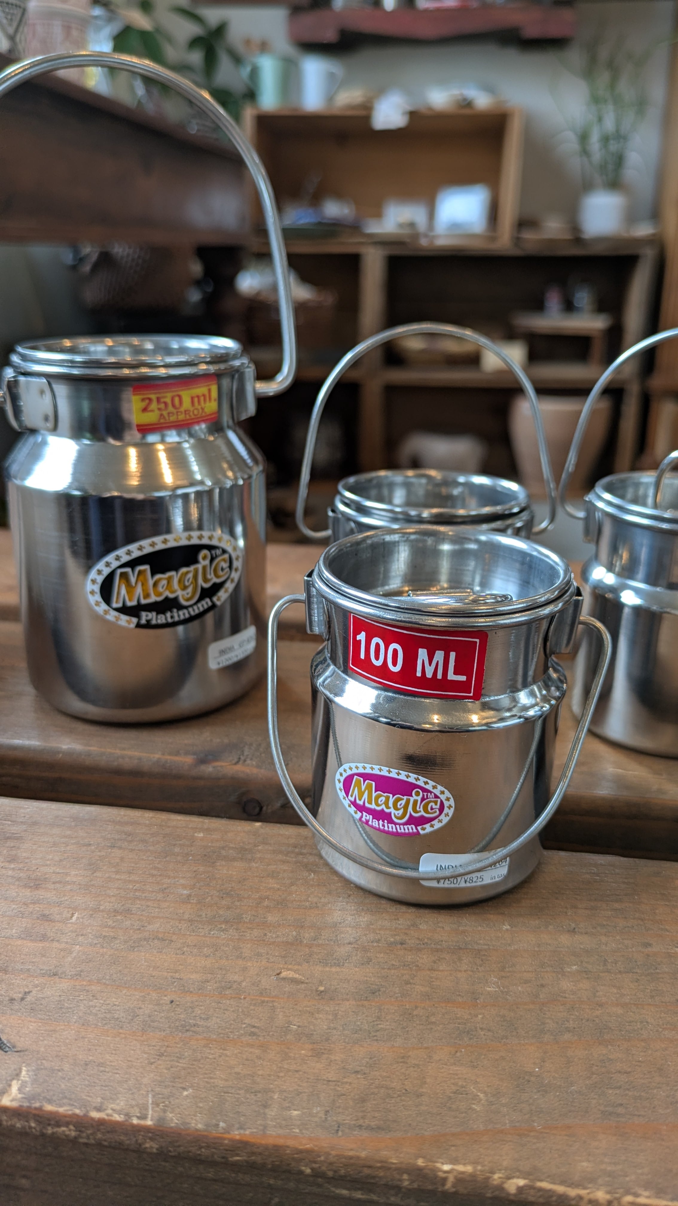 インドの伝統的な雰囲気を感じさせる、ステンレス製の取っ手付きのポットです