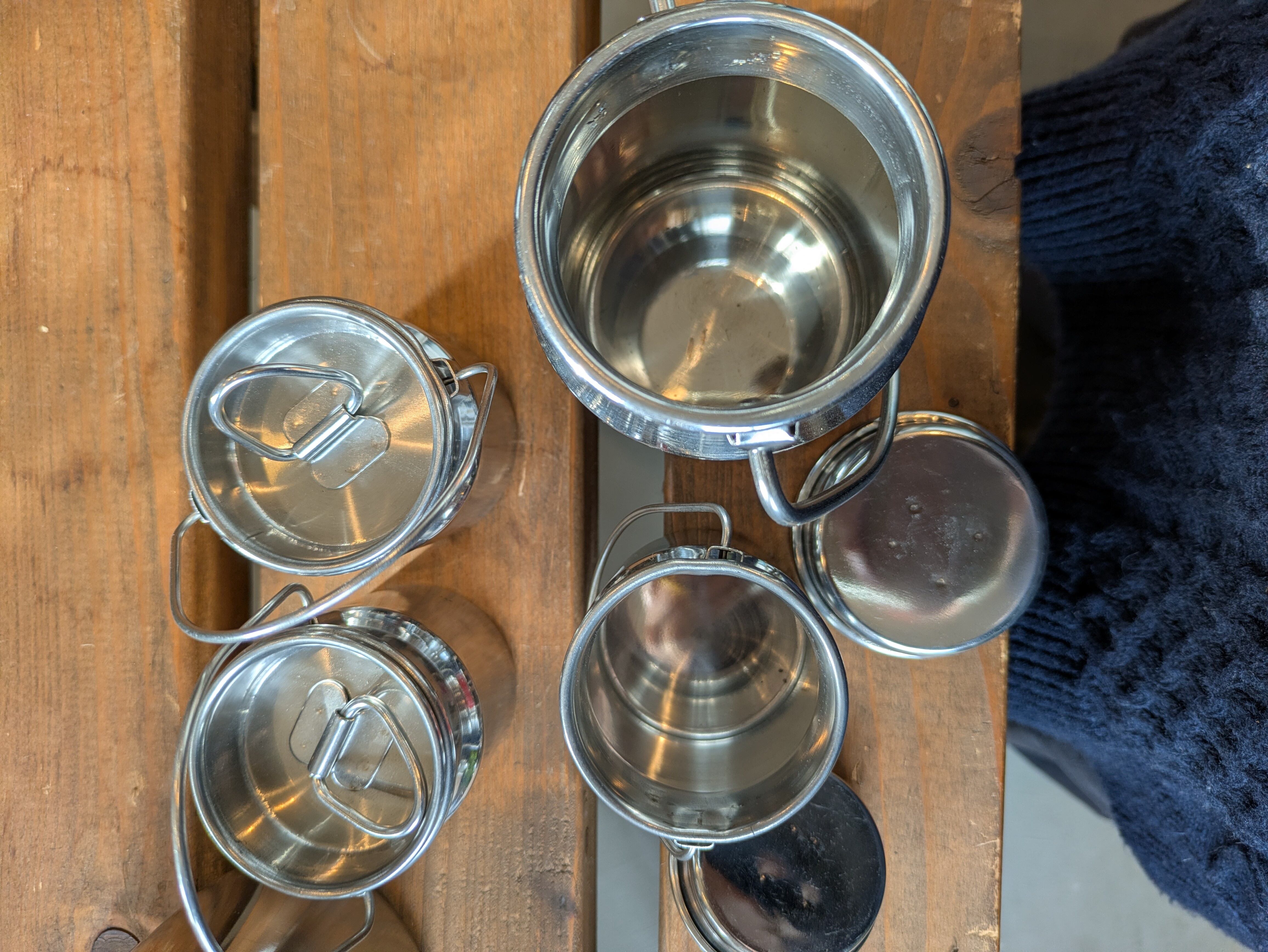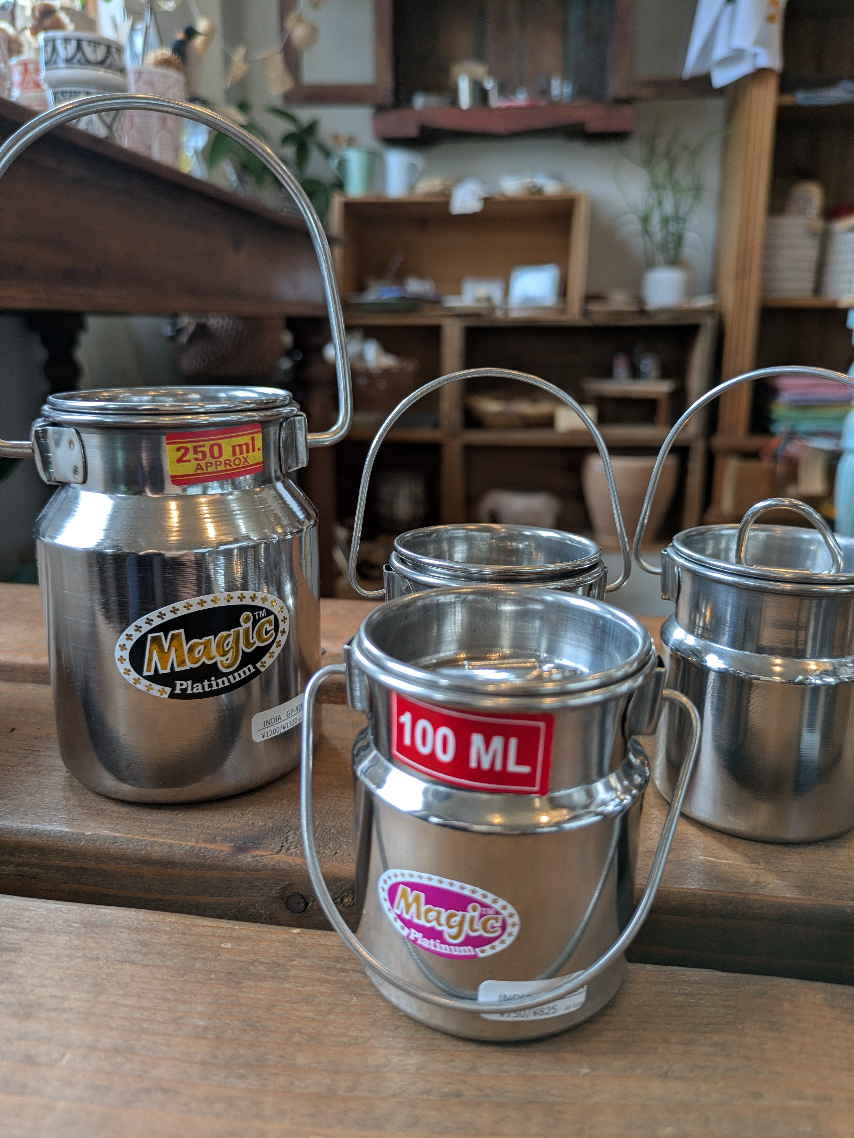 光沢をもつこのポットは、インドではギーを入れる容器などに使われています