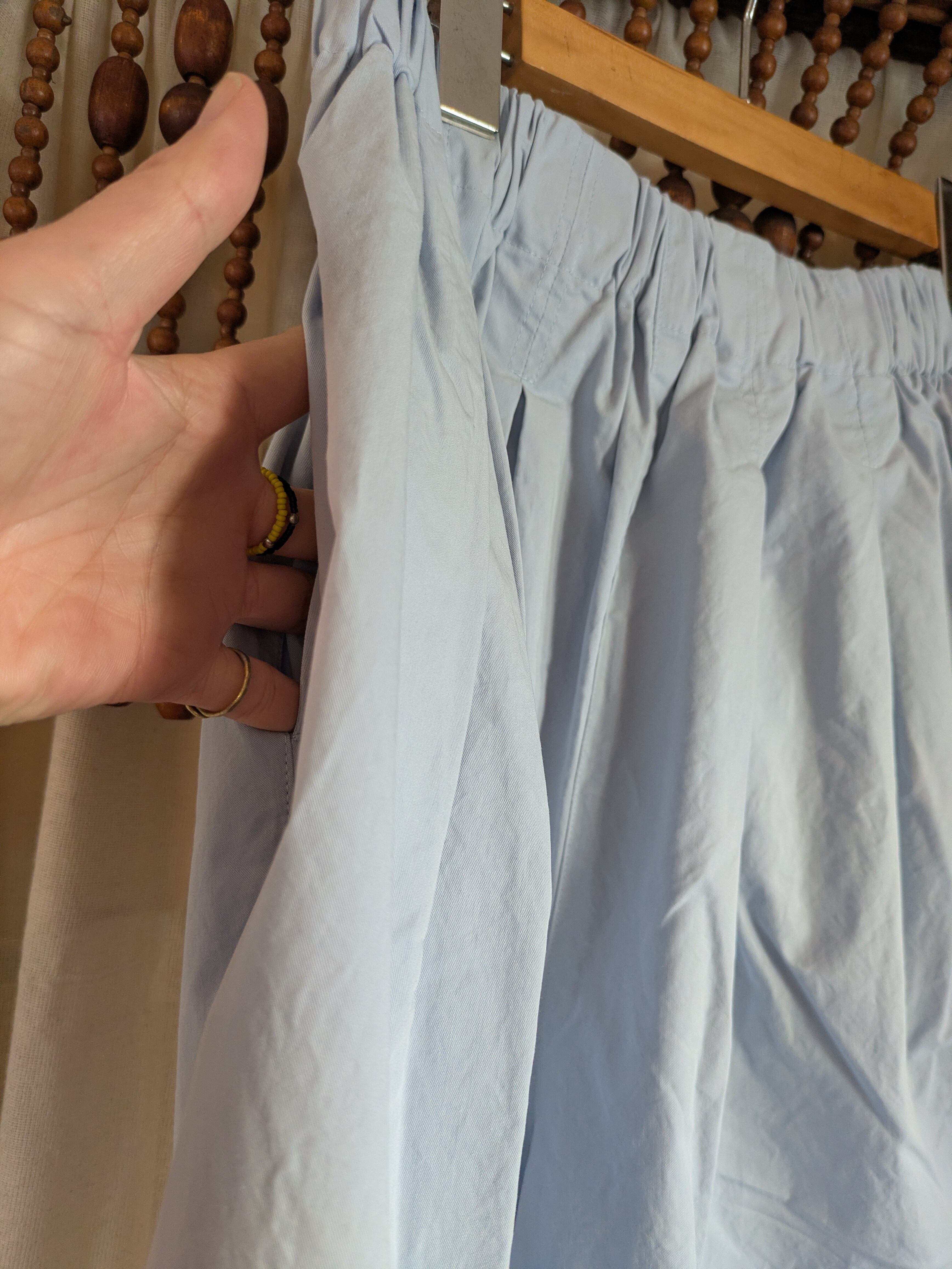 ウエストはゴム入りで紐付きの為、締め付け感の無い履き心地です