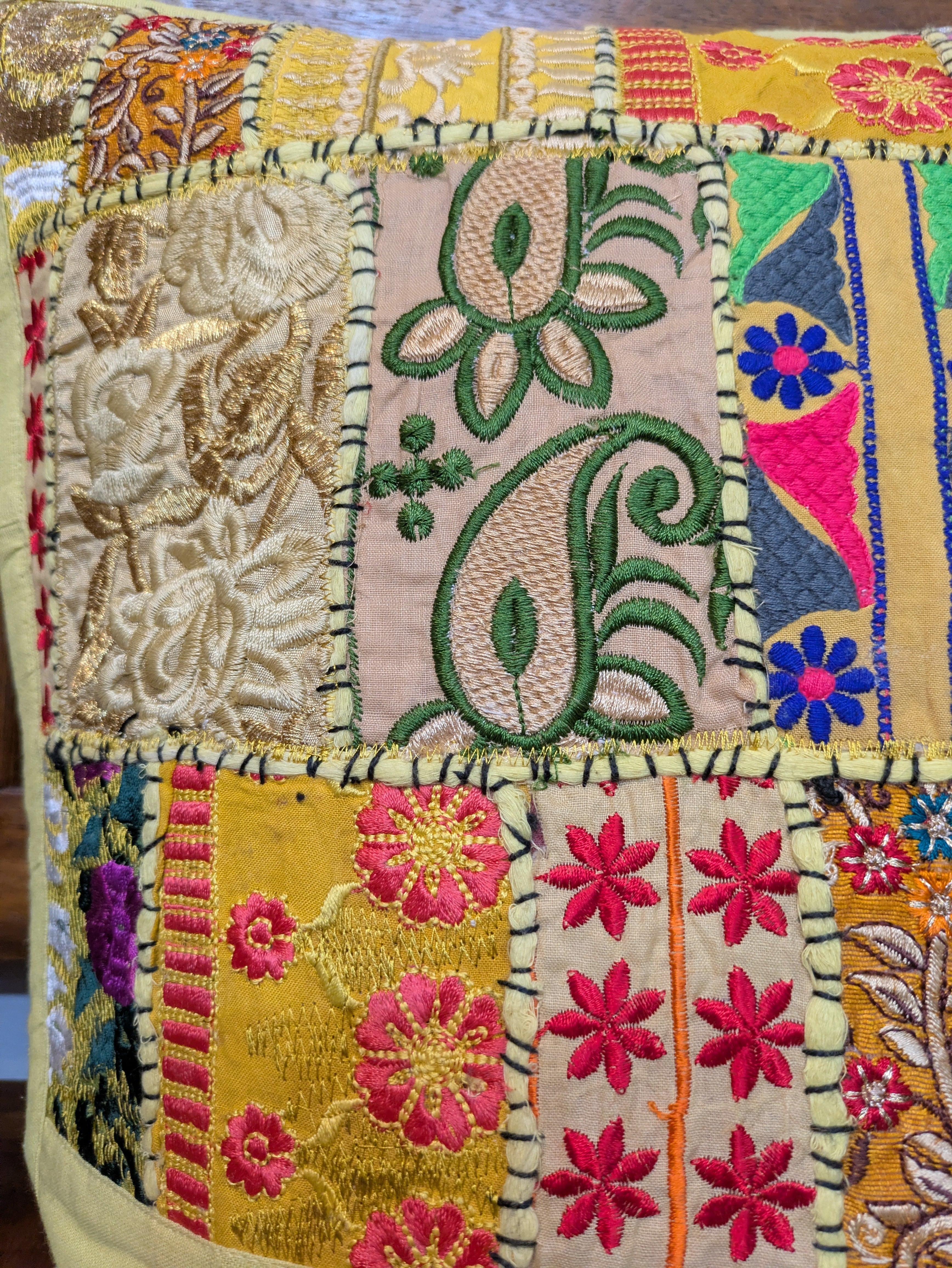 インドの古布をふんだんに使用した豪華なクッションカバーです