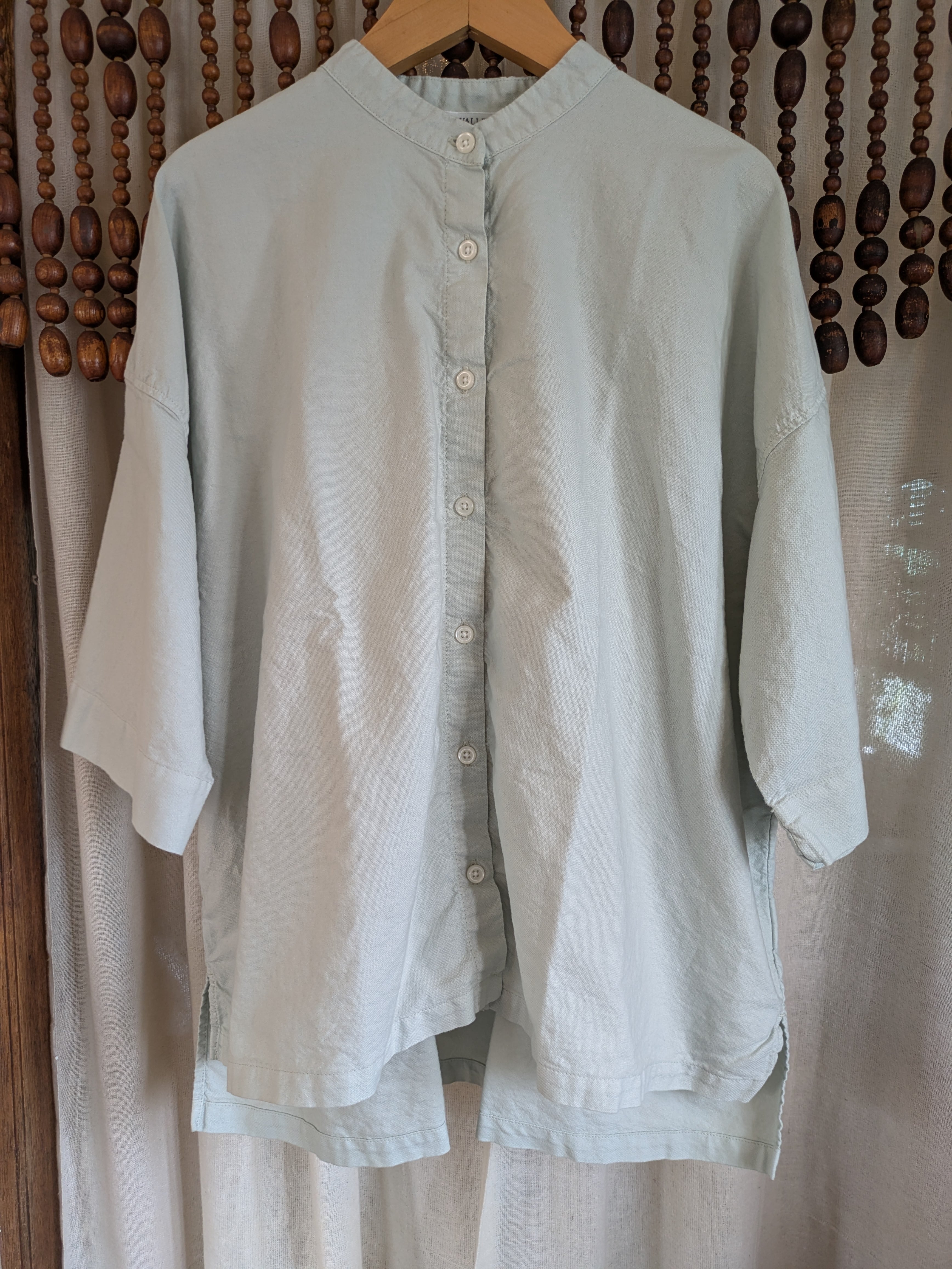 ベーシックに着回しやすいレギュラーシャツをコンパクトなスタンドカラーに仕立ててくれました