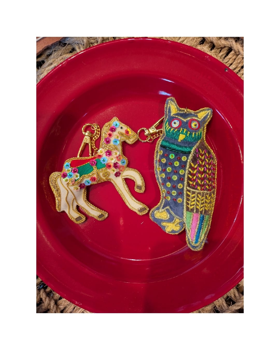 インドの職人さんの丁寧な手刺繍ザリ刺繍で表現された、縁起良いフクロウモチーフのバッグチャームです