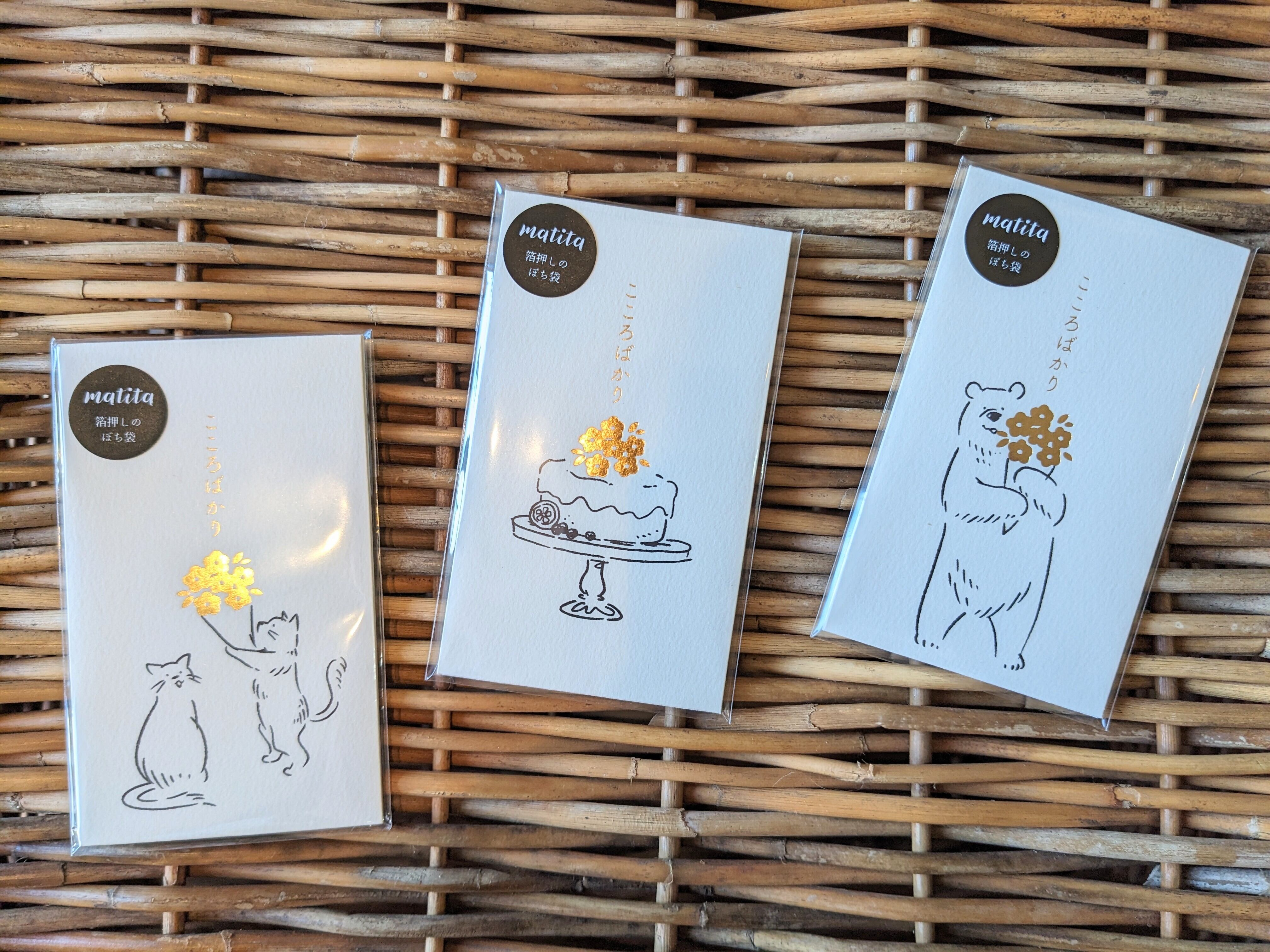 鉛筆で描いたようなイラストの動物たちがプレゼントやお花を届けてくれる、ほっこり可愛いぽち袋!