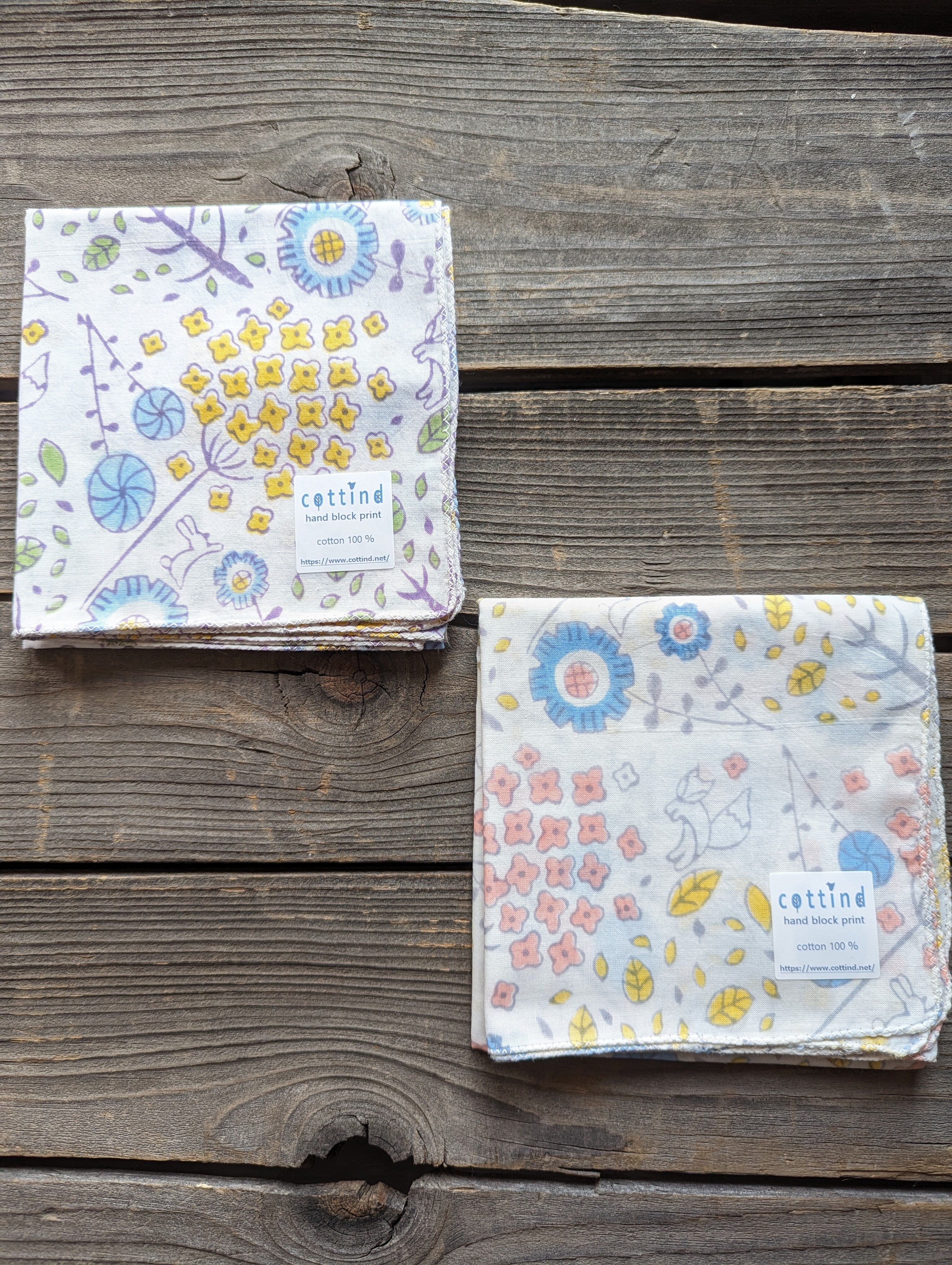 cottindオリジナルの図案から木版を彫っていただき、インドのブロックプリント工房にてひとつひとつ染めていただいています。